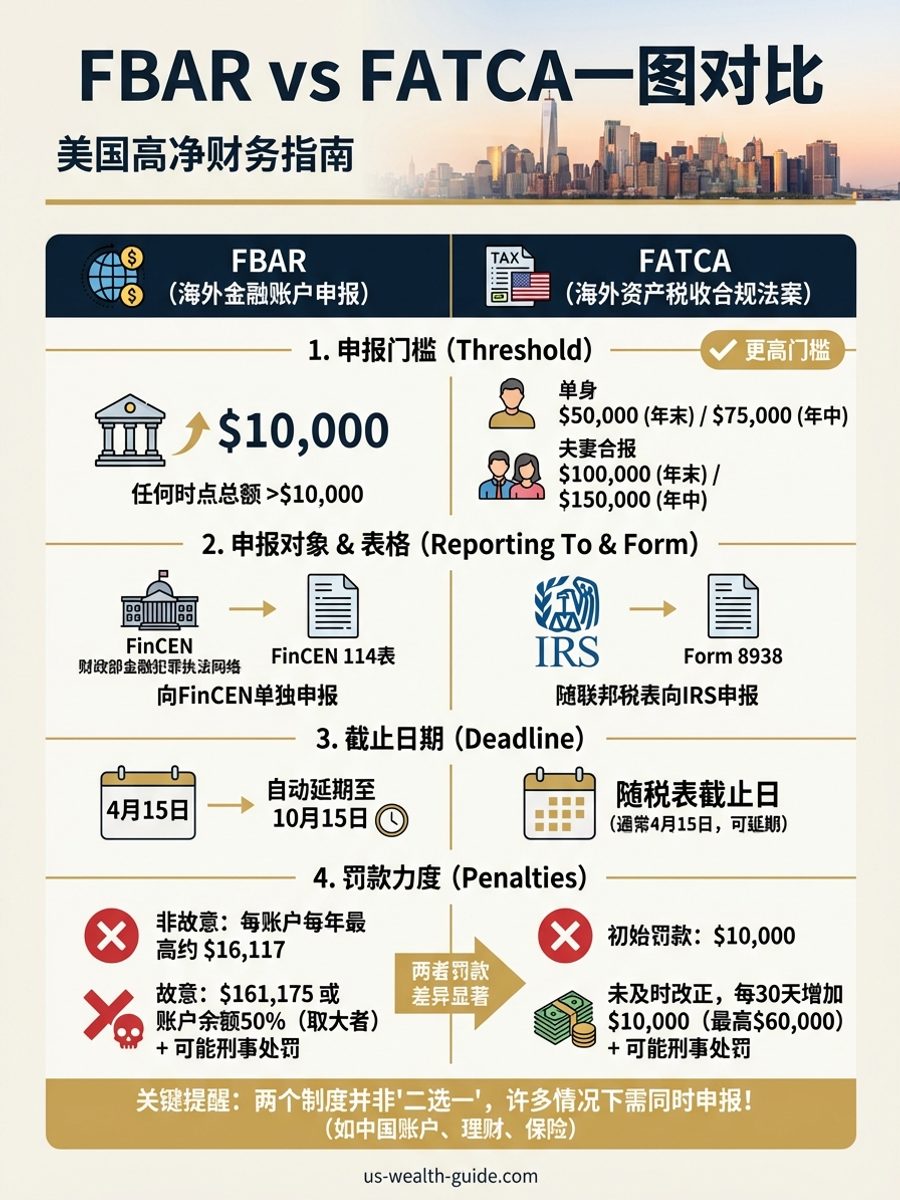 信息图:FBAR与FATCA海外资产申报对比 — 申报门槛($10,000 vs $50,000)、表格、截止日期和罚款力度四维对比