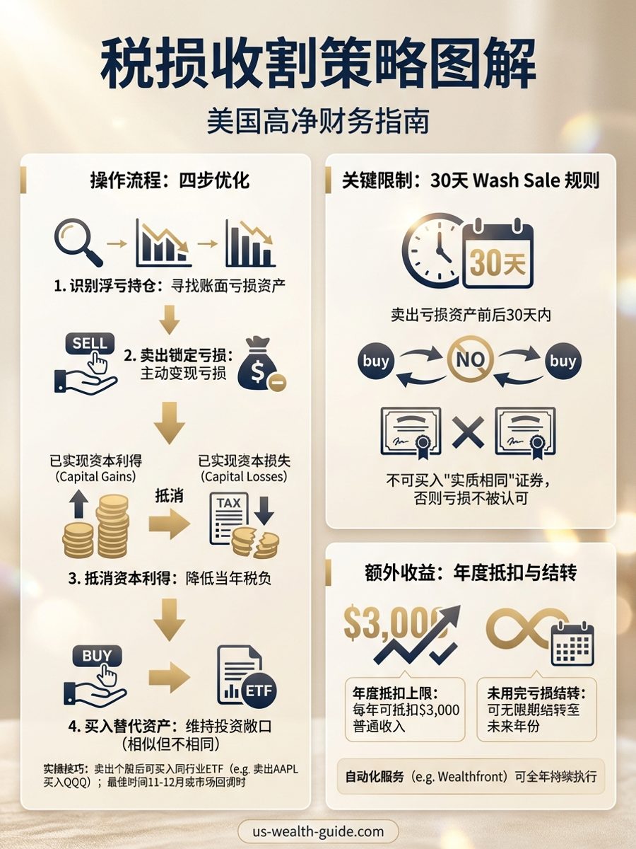 信息图:税损收割策略四步流程 — 识别浮亏、卖出锁定、抵消利得、买入替代资产,含30天Wash Sale规则和$3,000年度抵扣上限